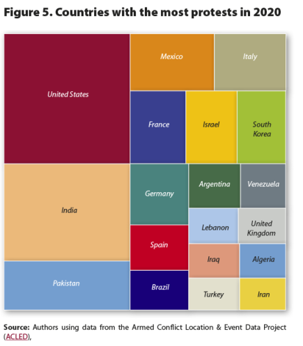 n this situation of a global increase in protests, the exception is Asia where the region as a whole shows fewer incidents of unrest. However, and contrary to the regional pattern, it is also the continent with two countries with the greatest number of protests in 2020, India and Pakistan. Yet, on the global scale, the country that recorded the largest number of manifestations of social unrest was the United States which had almost as many demonstrations as India and Pakistan combined, as Figure 5 reveals.
