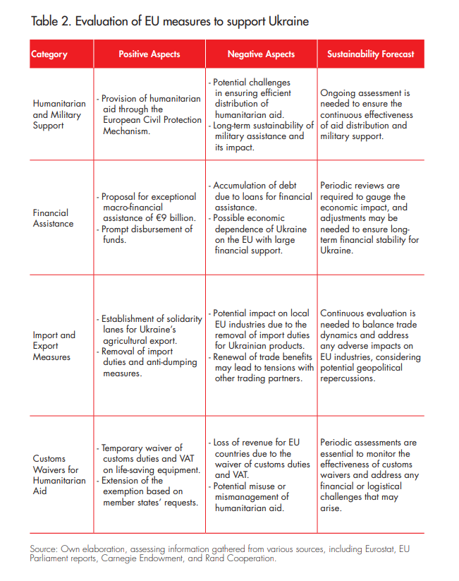 Table 2 evaluates key EU measures supporting Ukraine, covering humanitarian and military support, financial assistance, import/export measures, and customs waivers for humanitarian aid. It considers positive aspects, drawbacks, sustainability forecasts, and academic relevance. EU's support is crucial for Ukraine's defense capabilities, deterring further aggression and enhancing regional stability. Financial assistance aids Ukraine's economic recovery, pivotal for resilience and independence. Sustainability hinges on ongoing economic efforts. Import/export measures stimulate trade, but managing potential imbalances is vital. Customs waivers for humanitarian aid ensure efficient crisis response. These measures collectively bolster Ukraine's security, economy, and crisis response, reflecting the EU's commitment to Ukraine's stability and recovery.